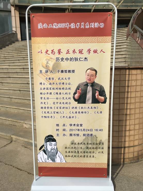 5月24日下午,由图书馆和团委联合举办的2017年陕西工院读书月系列活动之文化大讲堂在学术会堂开讲,本次讲座特邀陕西著名学者、陕西师范大学历史文化学院教授、博士生导师于赓哲教授为师生做题为“以史为鉴正衣冠学做人——历史中的狄仁杰”专题讲座。