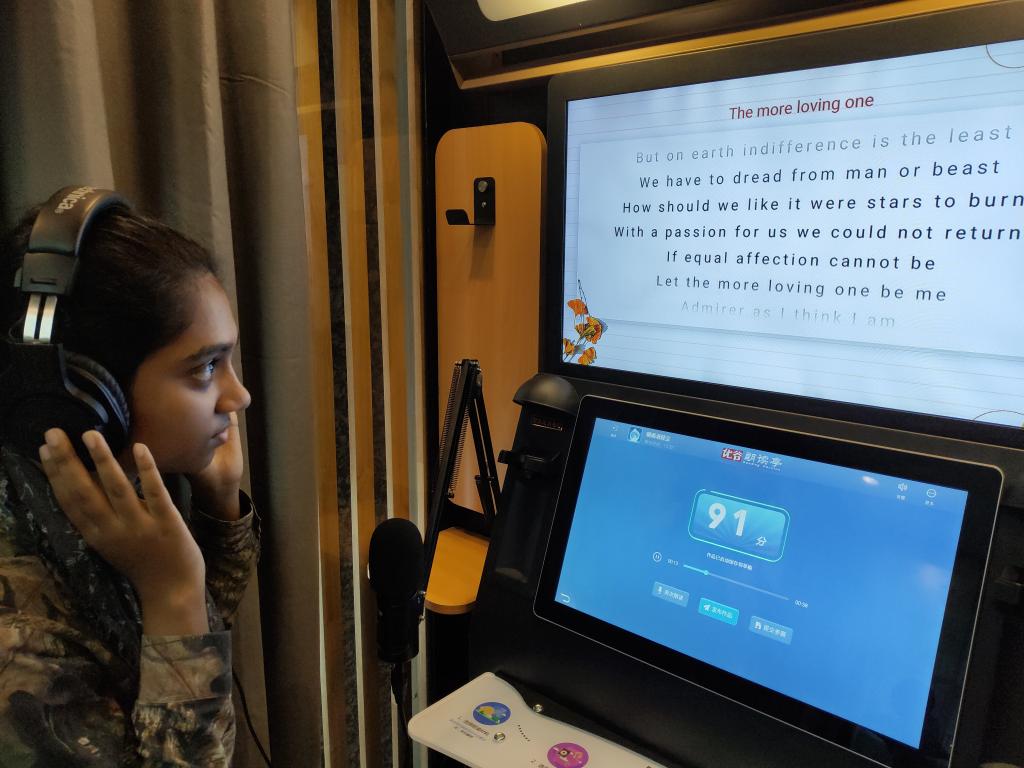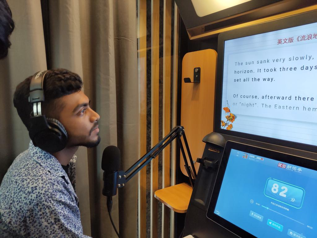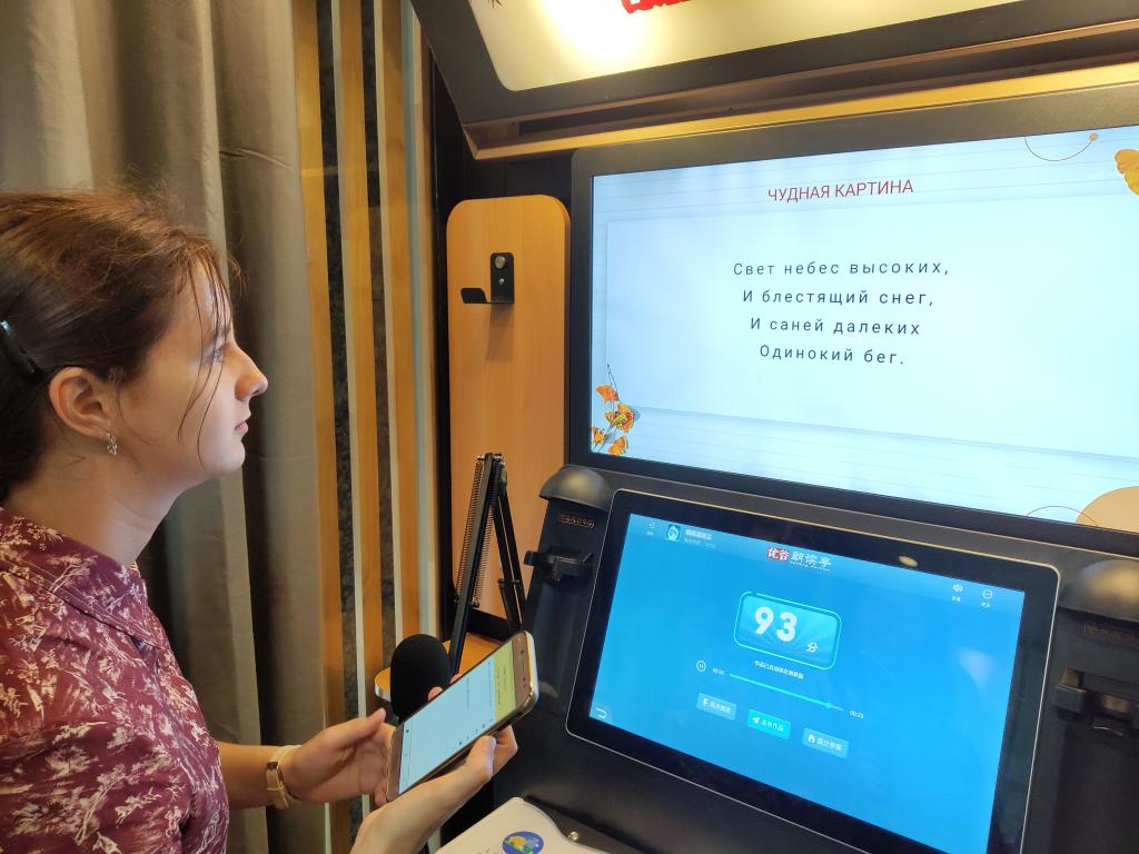 参观结束后,留学生们逐个进入朗读亭,诵读自己喜欢的诗文,其中不乏英语、俄语等多个语种。在获悉当天是第35个教师节时,留学生们纷纷表达了自己对老师们的祝福,并录制了中英文双语视频向老师们表达敬意。