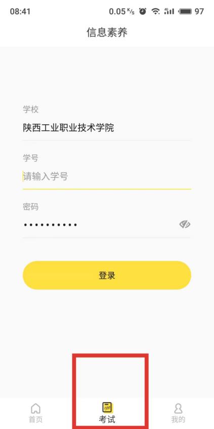 二、在“考试”栏目中输入“院校”、“学号”、“密码”,与电脑端账号一致,点击登录即可答题。