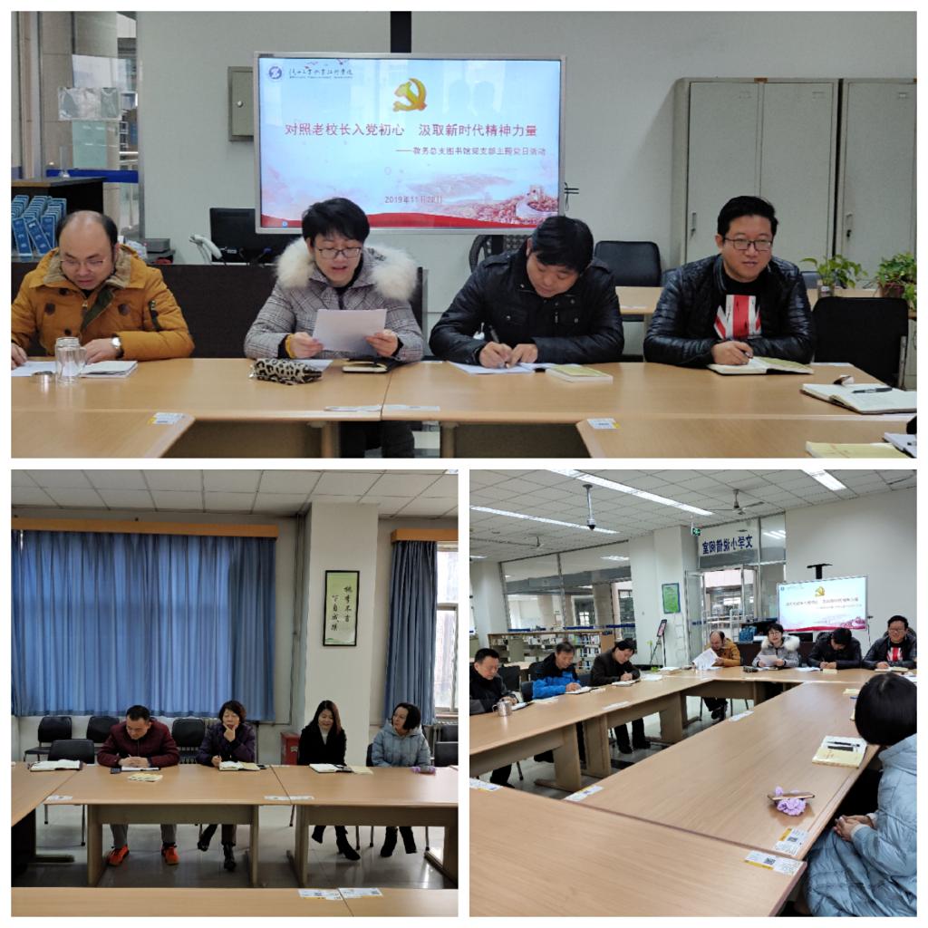 2019年11月28日上午,图书馆党支部在图书馆四楼南书库开展“对照老校长入党初心,汲取新时代精神力量”主题党日活动。活动由支部书记王丁同志主持,图书馆支部全体党员参加了本次主题党日活动。
