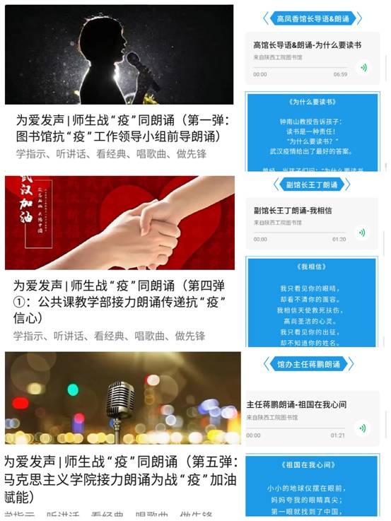 为持续推进抗疫工作,图书馆呼应学院“学指示、听讲话、看经典、唱歌曲、做先锋”倡议,发起“为爱发声:师生战‘疫’同朗诵”活动。
