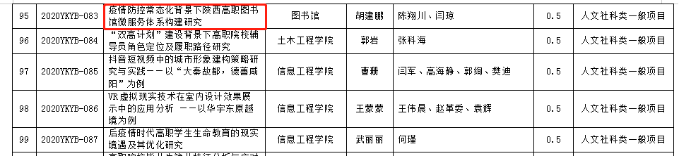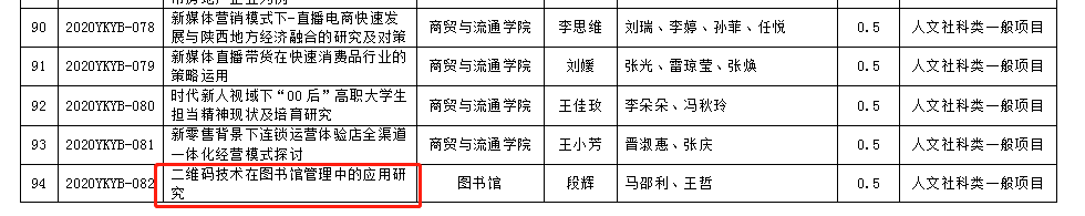 近日,学院公布了2020年院级科研项目立项结果,图书馆共有三项课题获批立项。王丁主持的《共生理论视域下“高校+书店”融合发展模式研究与实践》获批人文社科类重点项目,段辉主持的《二维码技术在图书馆管理中的应用研究》及胡建鹏主持的《疫情防控常态化背景下陕西高职图书馆微服务体系构建研究》获批人文社科类一般项目。
