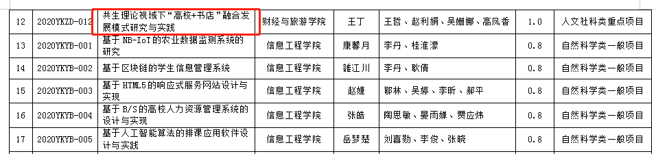 据悉,我院2020年院级科研项目立项120项。其中院级科研计划项目立项102项(自然科学重点项目6项,一般项目55项;人文社科重点项目6项,一般项目35项),院级专项科研项目立项18项(党建专项11项、科技创新专项3项、校企合作专项2项、科技扶贫专项1项,成果转化培育专项1项)。