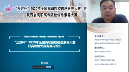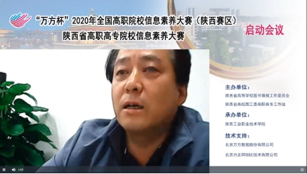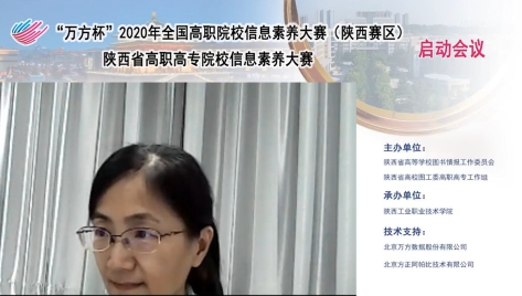 9月21日下午,由陕西省高等学校图书情报工作委员会、陕西省高校图工委高职高专工作组主办,我院承办的2020年陕西省高职院校信息素养大赛启动会通过万方平台召开。会议围绕“2020年陕西省高职院校信息素养大赛”的赛项说明、组委会安排、竞赛平台使用培训、教师参赛经验交流等相关主题展开了研讨交流。