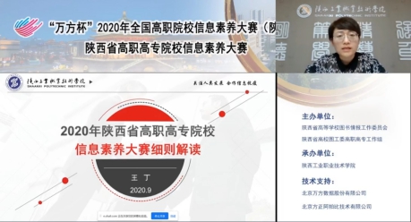 陕西赛区组委会秘书长、陕西工业职业技术学院图书馆副馆长王丁作了“2020年陕西省高职高专院校信息素养大赛细则解读”的报告,分别就第二届大赛的参赛对象、赛项说明、竞赛时间安排及评审选拔办法、省赛命题和模拟备考、奖项设置等相关事项予以详细地说明。