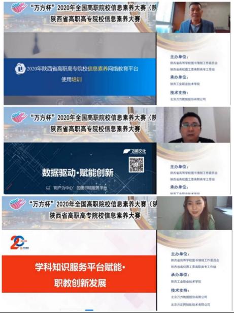 方正阿帕比讲师杨宁波、浙江飞阅文化创意有限公司区域经理白帆多、北京万方数据股份有限公司产品经理黄文雅分别做了题为《2020年陕西省高职高专院校信息素养选拔赛比赛平台相关培训》、《数据驱动·赋能创新——以用户为中心的图书馆云服务平台》、《学科知识服务平台赋能职教创新发展》的报告。