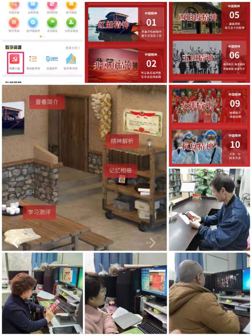 图书馆党支部结合业务工作特点,利用馆藏思政类数据库在图书馆公众号的“微图书馆”平台上搭建了党建学习平台——“党建小屋”,以十大“中国精神”为脉络进行主题展览,包括红船精神、井冈山精神、长征精神、延安精神、西柏坡精神、五四精神、雷锋精神、载人航天精神、女排精神、抗疫精神。党员同志进入学习平台后,可从精神内涵、精神解析、记忆相册、影视资料等模块了解构筑起中国共产党人的精神谱系。