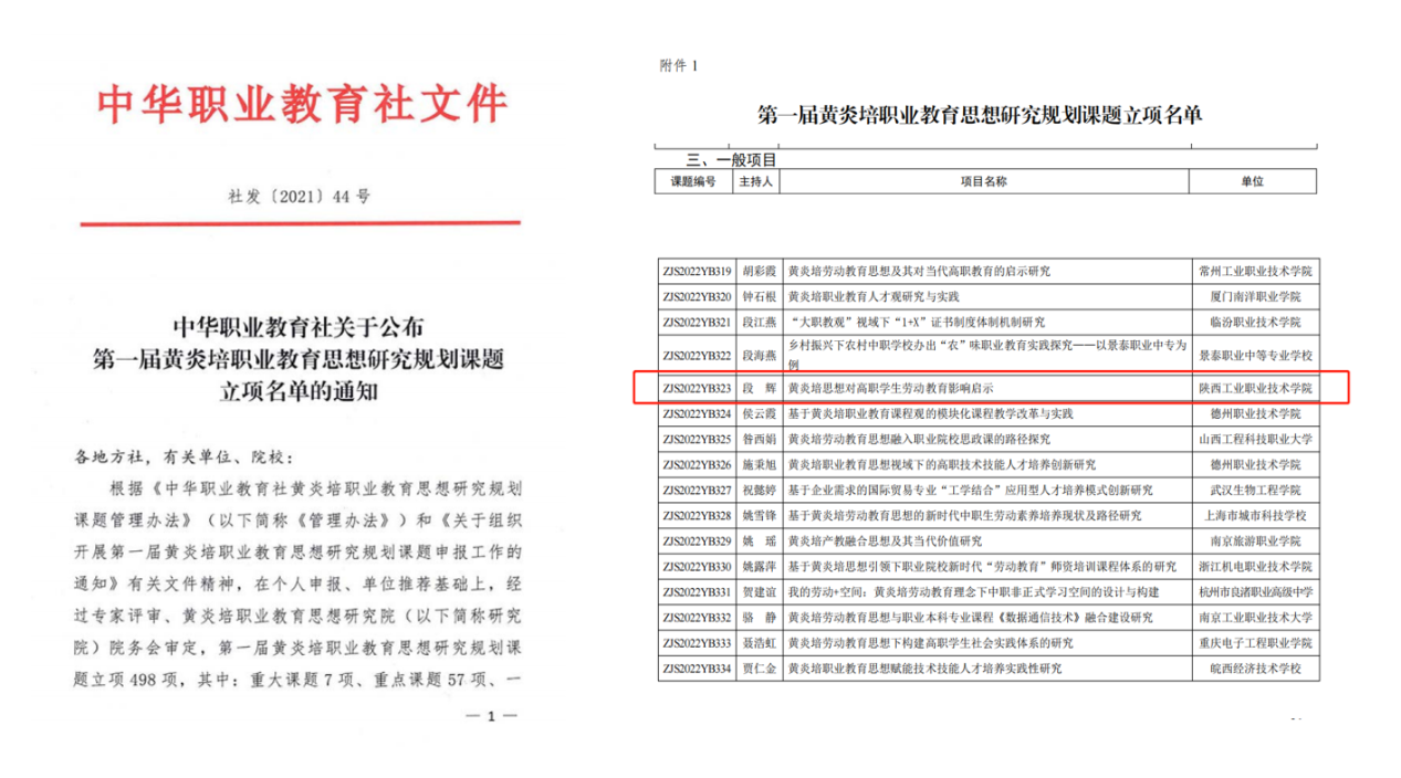 近日,中华职业教育社发布了关于“第一届黄炎培职业教育思想研究规划课题”评审结果公示通知,我校图书馆段辉老师主持的《黄炎培思想对高职学生劳动教育影响启示》(ZJS2022YB323)课题获批立项。