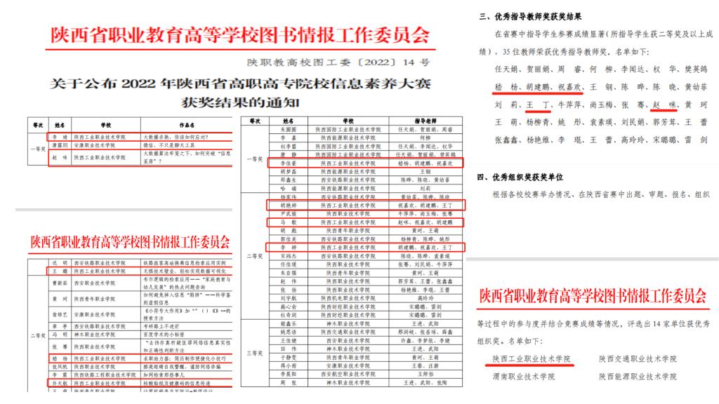 近日,2022年陕西省高职高专院校信息素养大赛圆满落幕,我校师生在教师微课赛与学生个人赛中均取得了不俗成绩,斩获了两个教师、学生两个赛项的一等奖等多个奖项,我院荣获“优秀组织奖”。