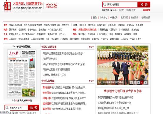 主要栏目内容:包括《领导人活动报道库》、含《新版人民日报图文数据库》的《党报党刊》及《子报子刊》、三会(“两会”加党代会)、中国共产党重大事件/重要人物/重要文献、国家及地方法律法规文献、中国及世界人文文化、历史、中国及世界军事、经济、管理、中国舆情信息等;