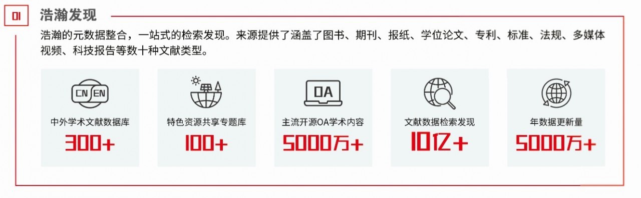 海量的元数据整合,一站式的检索发现。来源涵盖图书、期刊、报纸、学位论文、专利、标准、法规、多媒体视频、科技报告等数十种文献类型,超过300个中外数据库、数百个资源自建库、5000余万主流开放OA学术文献、体验10亿级文献数据的资源检索发现。年更新文献量超过5000万条。