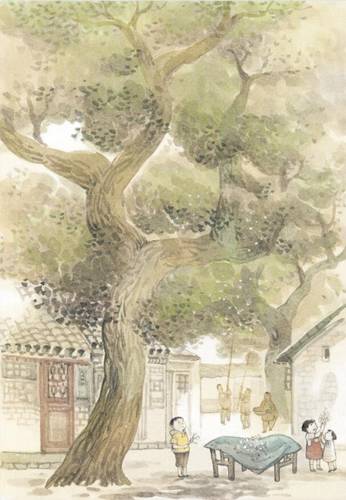 “打槐花”(《我们的老院》插画,作者:杜凌云)