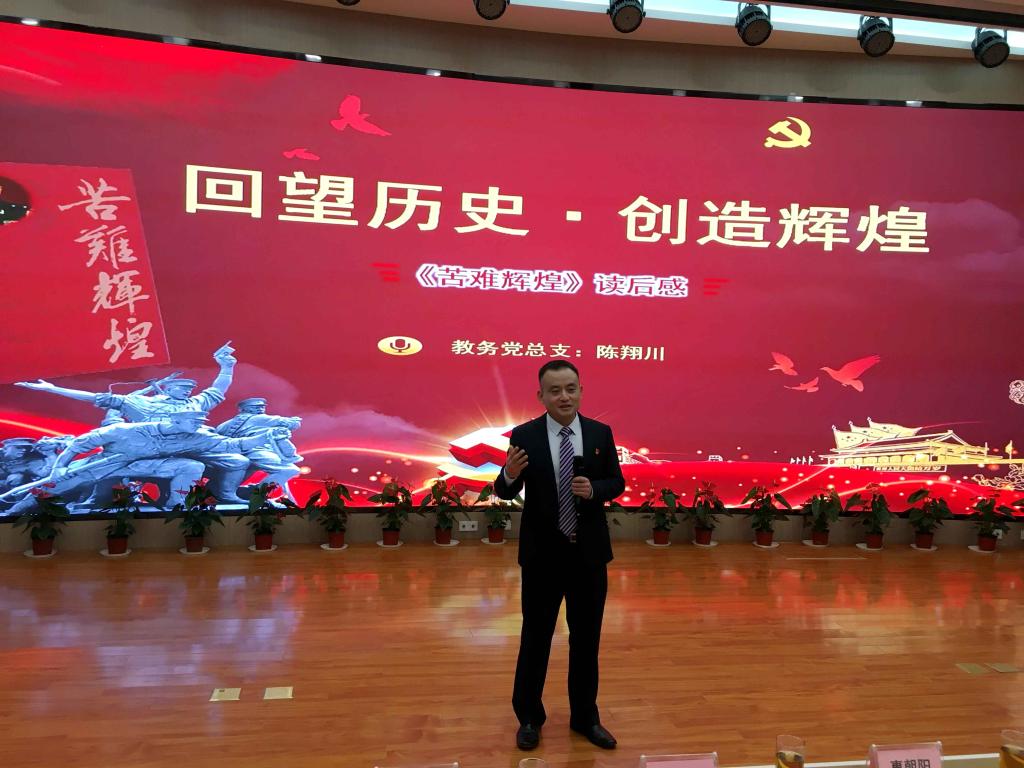 陈翔川同志以“回望历史,创造辉煌”为主题,从“信仰”的角度为大家解读金一南的著作《苦难辉煌》,他从中国共产党创造历史辉煌的艰难历程讲起,讲述了革命先辈的不屈岁月,中国共产党人正是经历了难以想象的地狱之火,带领中华民族探测到了前所未有的历史深度和时代宽度。最后,陈翔川同志呼吁广大党员同志继承先辈们勇于牺牲,无私奉献,为中华崛起之信仰,勇挑时代之重担,为民族伟大复兴贡献我辈之力量!