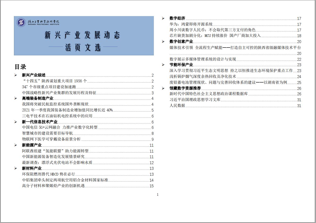 为了更好地服务教学、科研和学科专业建设,更好地发挥图书馆信息服务职能的作用,图书馆深入挖掘馆藏数字资源,从“新兴产业综述、高端装备制造产业、新一代信息技术产业、新能源产业、新材料产业、数字经济、数字创意产业、节能环保产业”等八个维度,整理新兴产业发展动态活页文选,以期为我院教师的科研、教学实践、专业建设等提供一定的参考和帮助。